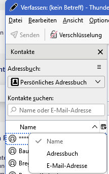 Die Adressenauflistung in "Verrfassen" ist bei mir ein heilloses Durcheinander. Im Adressbuch aber alphabetisch geordnet.