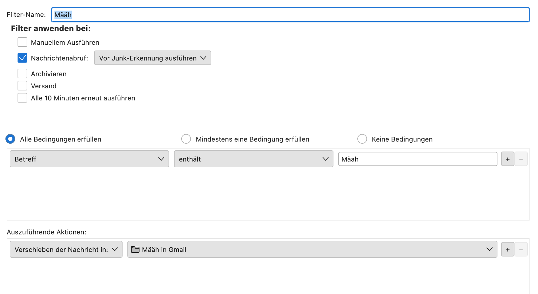 Der Filter wirkt weder beim Abruf noch beim manuellen Ausführen auf eine Nachricht mit "Mäah" im Betreff.