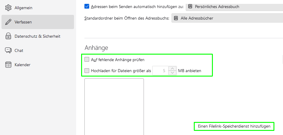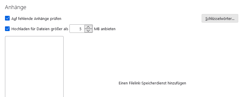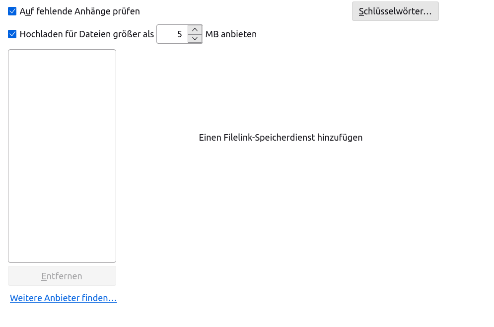 ich möchte die Filelink-Funktionalität nutzen, stelle aber fest, dass in meiner Thunderbird-Installation (115.1.0, Linux) in den Einstellungen die entsprechende Ankreuzoption fehlt. Es wird mir nur ein Feld angeboten, durch dessen Anhaken ich mich daran erinnern lassen kann, vergessene Attachments anzuhängen. Als Add-On habe ich den Filelink-Provider für Send installiert; dieser wird auch angezeigt, ist aber ausgegraut. Im Config Editor habe ich nach Einträgen zu Filelink gesucht; einen gefunden und auf true gestellt; leider ohne Ergebnis.