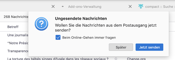 Wenn ich TB beende, kommt keine Dialogbox, die mich fragt ob ich die Mail im Postausgang jetzt verschicken will oder später.