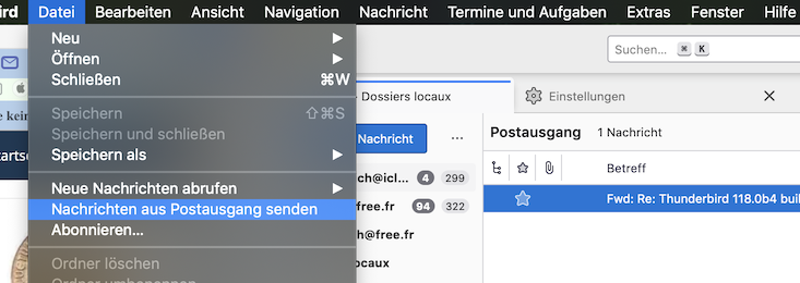 Du solltest auch die verschiedenen Menüs durchforsten. Ich finde zusätzlich noch im Menü "Datei" die Funktion "Nachrichten aus dem Postausgang senden"