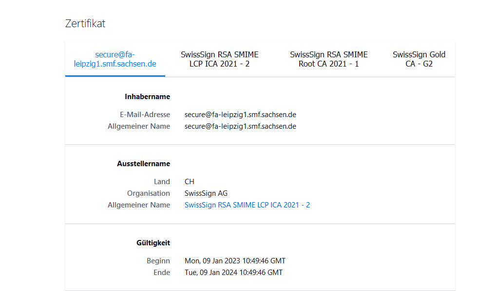 ich möchte dem Finanzamt Leipzig eine verschlüsselte Mail senden, die Kollegen sind die ersten bei den ich die entsprechende Mailadresse mit Downloadlink ihres öffentlichen Schlüssel sofort auf der Homepage finde, finde ich super!