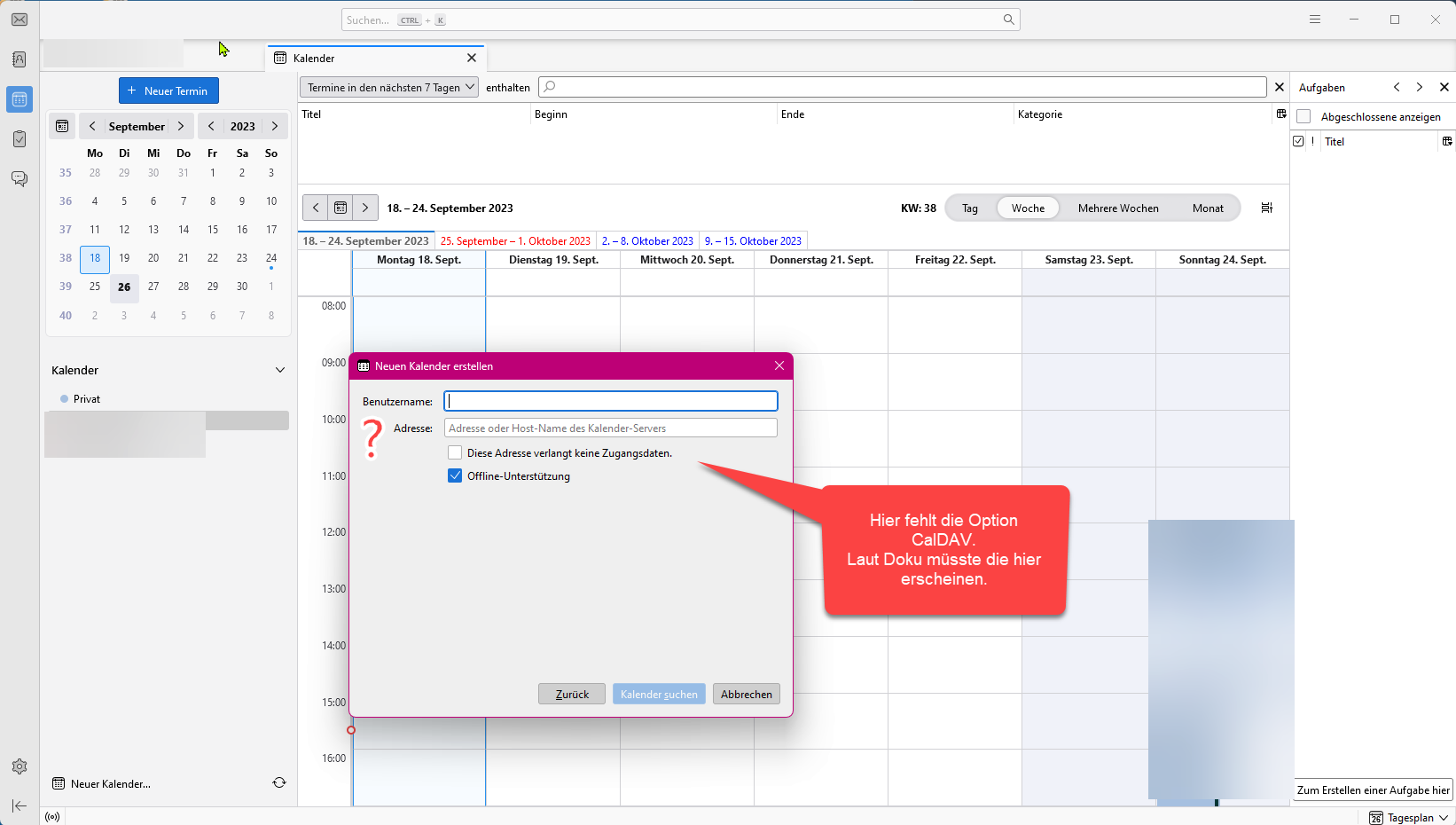 Thunderbird (TB) 115.2.3 fehlt die Option CalDAV beim Hinzufügen eines Netzwerk Kalender