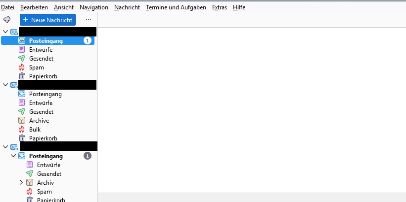 Erst funktionierte es noch sporadisch, wobei ich dafür Thunderbird 1 - 2 x neu starten und über "Ansicht/Ordner" die Punkte "Alle Ordner" und