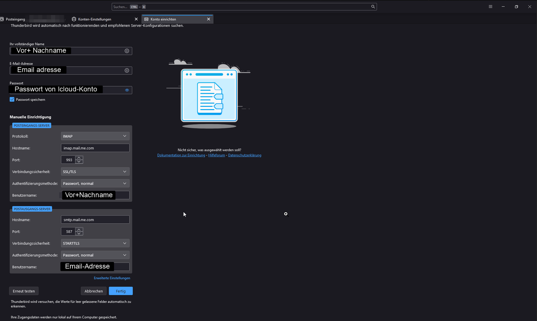Moin, ich will meine Icloud email-adresse in Thunderbird einrichten. Wenn ich alles nach der Anleitung (E-Mail-Konto einrichten - Anleitung für iCloud, .Me und .Mac) ausfülle, dann kommt die Fehlermeldung: Anmeldung auf dem Server fehlgeschlagen. Eventuell sind Konfiguration, Benutzername oder Passwort nicht korrekt. Meiner Meinung nach sind aber alle dinge korrekt und ich habe dies auch mehrfach überprüft.