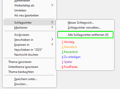 ich kann von einigen E-Mails die Schlagwörter nicht mehr dauerhaft entfernen. Ich kann die Nachricht öffnen, das Schlagwort entfernen (sowohl über Numkey 0, Numkey des Schlagworts, Kontextmenu), die Nachricht verliert dann augenscheinlich auch das Schlagwort erstmal. Sobald ich aber in einen anderen Ordner/Postfach gehe (oder das Programm wieder gestartet wird) haben die E-Mails wieder diese Schlagwörter. Ich kann diesen Nachrichten andere Schlagwörter zuordnen, die ich auch dauerhaft wieder entfernen kann. Anscheinend nur das "originale" nicht.
