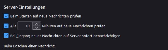Entsprechende Änderung der Server-Einstellungen bringt leider nichts (ich habe allerdings keine Auswahloption "Bei Eingang neuer Nachrichten auf Server sofort benachrichtigen", sondern nur "Neue Nachrichten automatisch herunterladen"; evtl., weil ich per POP und nicht per IMAP abrufe?!)