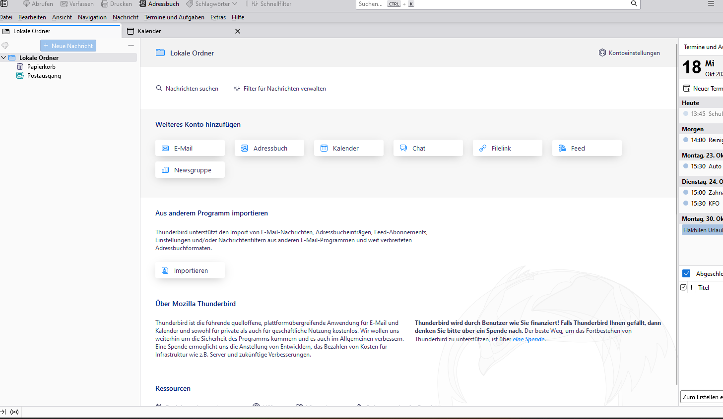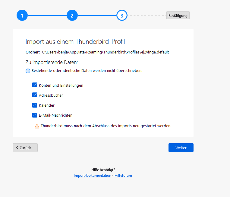 ich habe heute, nach Problemen beim Abrufen meiner Mails (inkl Versuch von POP3 auf IMAP zu ändern), meine 2 verbundenen Mailkonten entfernt, wollte diese anschließend wieder hinzufügen und die Daten importieren (hat in der Vergangenheit bereits mehrfach problemlos geklappt). Leider funktioniert der Import dieses Mal nicht. Nun kann ich weder auf meine Mails, Ordnerstruktur, Adressbuch und Kalendereintragungen zugreifen. Nach einigen Versuchen habe ich jetzt die ältere Version von TB installiert, in der Hoffnung damit mehr Erfolg zu haben.