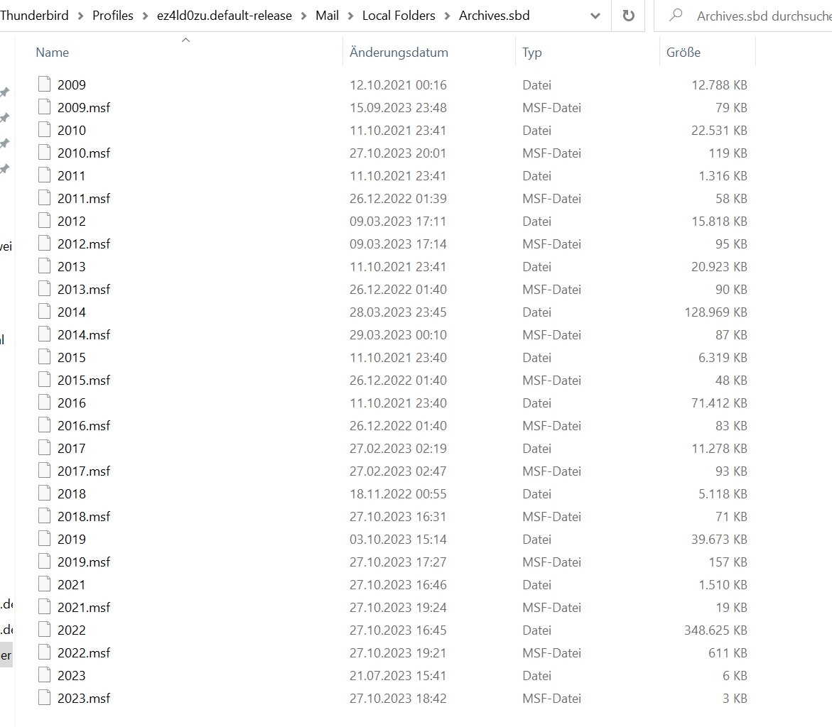 Ich habe ein Profilbackup von der letzten Formatierung aus Dezember 2022 gefunden. Eigentlich war ich mir sicher, dass ich vor wenigen Wochen noch mit den fehlenden Mails gearbeitet habe. Nach Sichtung des Backups mit ImportExportTools sind die fehlenden Jahre aber nicht aufgetaucht. Ich bin mir zu 100 % sicher, dass ich die Mails nicht händisch gelöscht habe und fange langsam an, an meinem Verstand zu zweifeln.