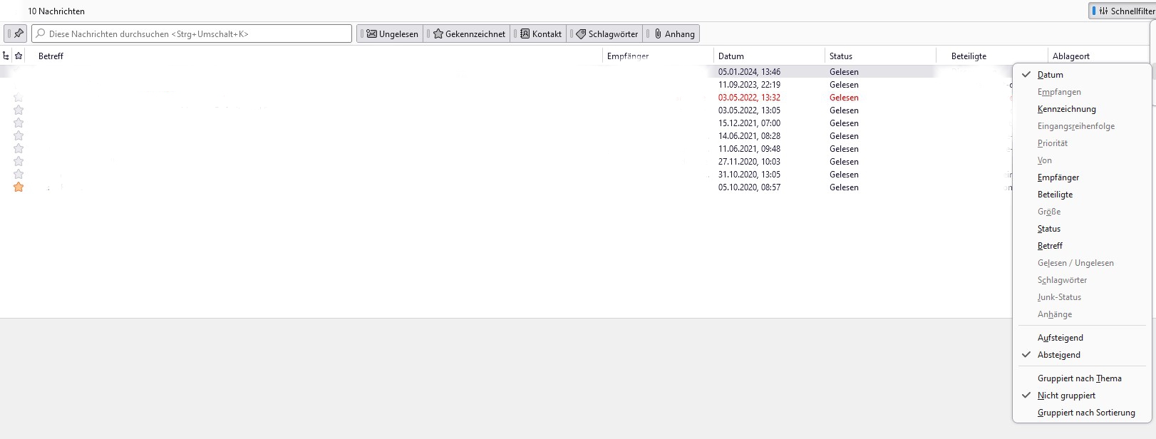 seit einiger Zeit habe ich Probleme mit der Suche innerhalb von Thunderbird. Ich suche nach einem Wort in Nachrichten aus der Vergangenheit. In der Liste der Suchergebnisse werden die Nachrichten korrekt angezeigt. Auch mit den ersten Textteilen und Anhängen. Öffne ich dann die EMail habe ich ein leeres Feld unter der Betreffzeile.