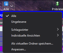 Könnte man im Kontexmenue des Buttons ( siehe Screenshot ) die beiden oberen Einträge Alle und Ungelesene in Alle Nachrichten und Ungelesene Nachrichten ändern? Hat jemand eine Idee?