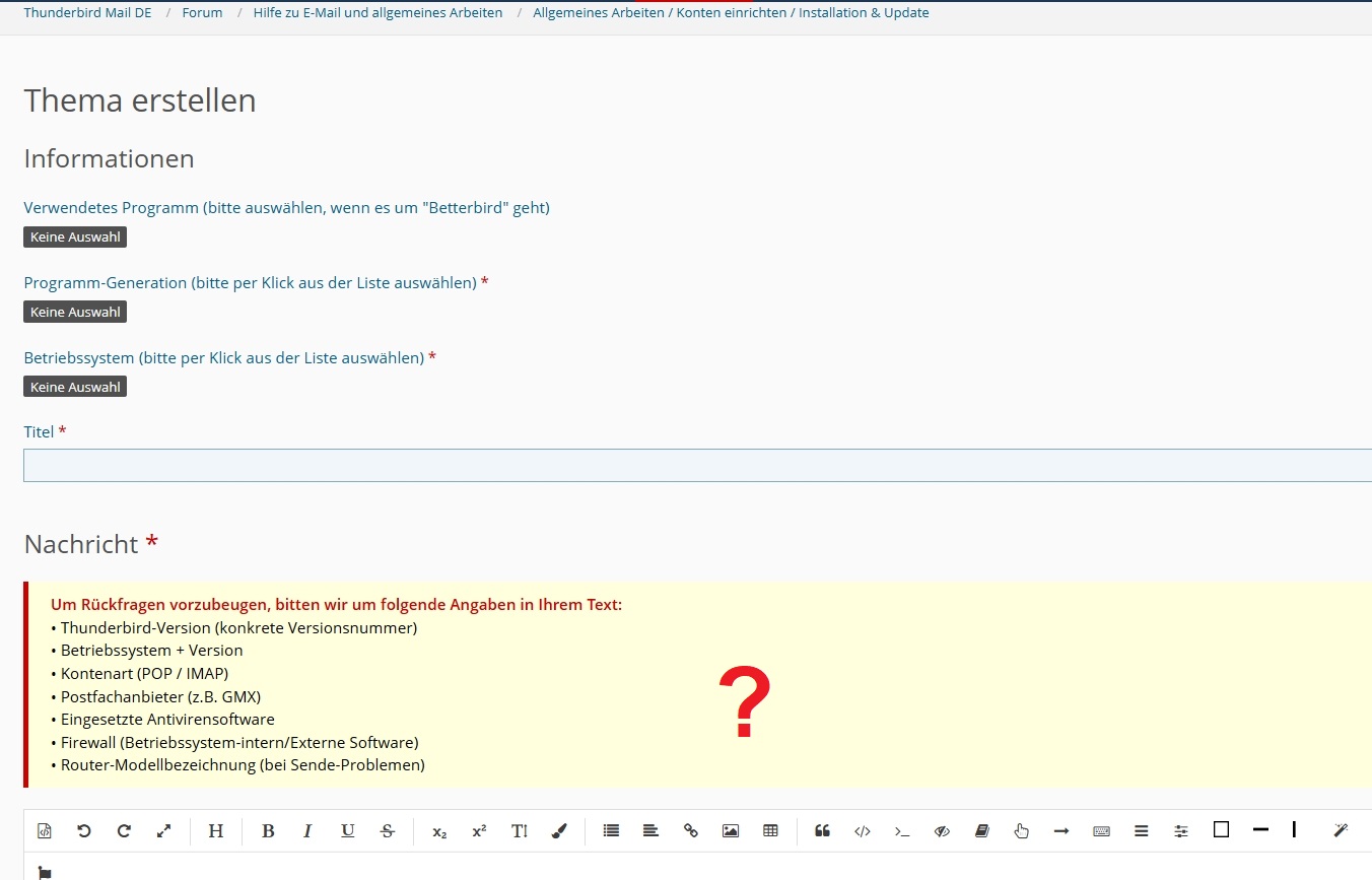 diese Angaben werden jeweils bei der Erstellung eines neues Themas in einem auffälligen, gelb hinterlegten Kasten abgefragt. Klick einfach mal oben rechts auf Neues Thema. Das war sicher auch bei Dir der Fall. Du hast das nur ignoriert.
