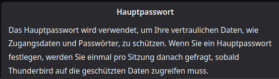Deshalb habe ich ein Hauptpasswort eingerichtet, das abgefragt wird, wenn man Thunderbird startet.