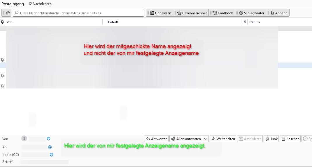 Bei mir wird in der Posteingangsübersicht im Feld "Von" der vom Absender mitgeschickte Name angezeigt und erst im Nachrichtenfenster der von mir fest gelegte Anzeigename.