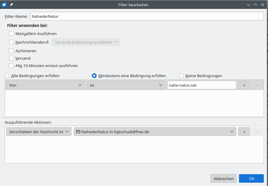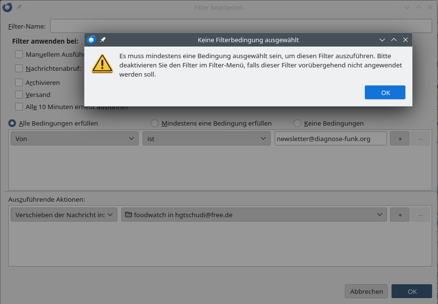 Ich erhalte beim Einrichten des Nachrichtenfilters meines Thunderbird folgende Meldung: