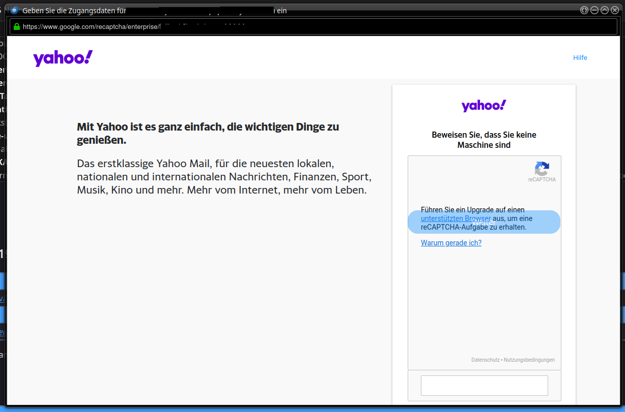 Die Suchfunktion hat zu meinem Problem nicht viel abgeworfen – seit gestern fordert Yahoo mich auf, meine Identität zu bestätigen, indem ich zunächst meine Mailadresse eingebe, um schließlich zu einem Captcha weitergeleitet zu werden. Leider kann TB keine Captchas darstellen: