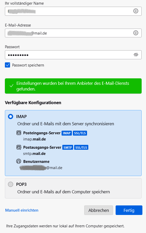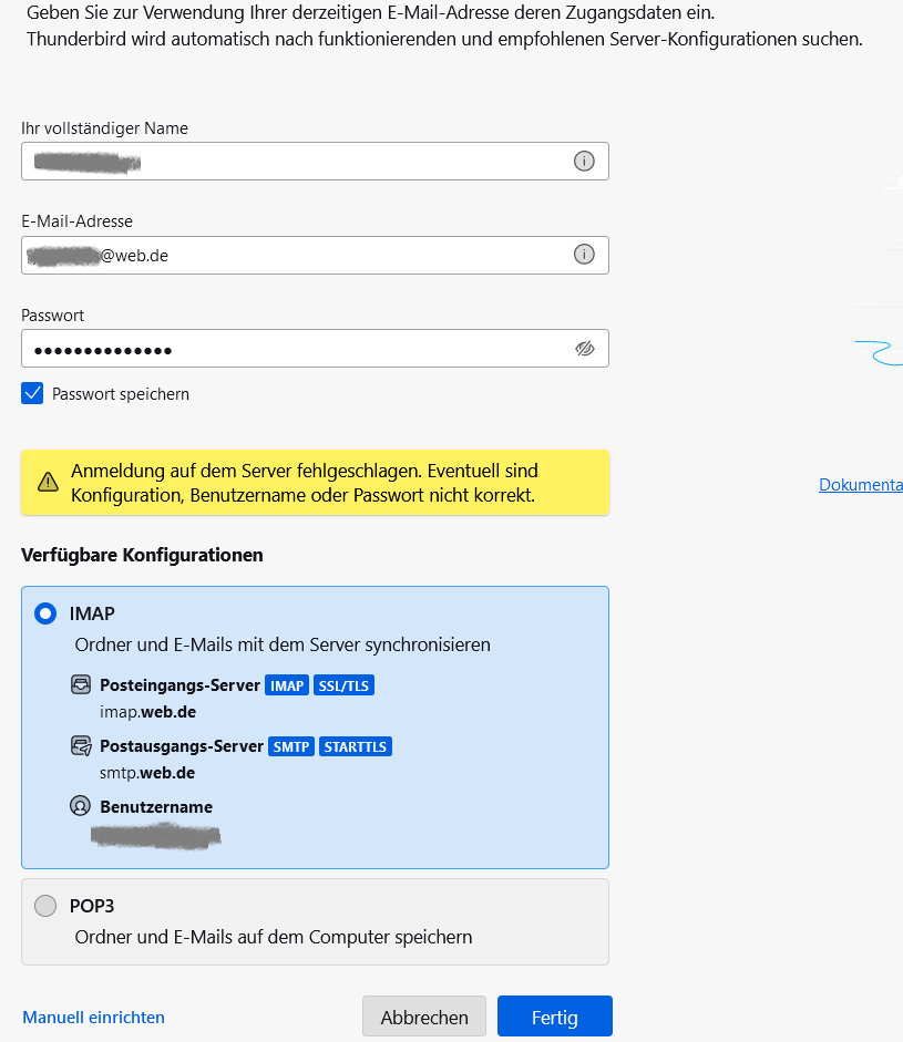 Zu Testzwecken habe ich dann ein bestehendes E-Mail-Konto von web.de hinzufügen wollen. Zunächst werden die Einstellungen beim Anbieter gefunden und dann heißt es: "Die Anmeldung ist auf dem Server fehlgeschlagen. Eventuell sind Konfiguration, Benutzername oder Passwort nicht korrekt."