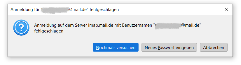 Seit dem 06.11.2023 (es ist nichts besonderes vorgefallen) kam dann der Hinweis (nur bei mail.de) "Anmeldung auf dem Server imap.mail.de mit Benutzernamen "xxx@mail.de" fehlgeschlagen" und wenn ich dann das Passwort erneut eingebe, dann geht alles von vorne los.