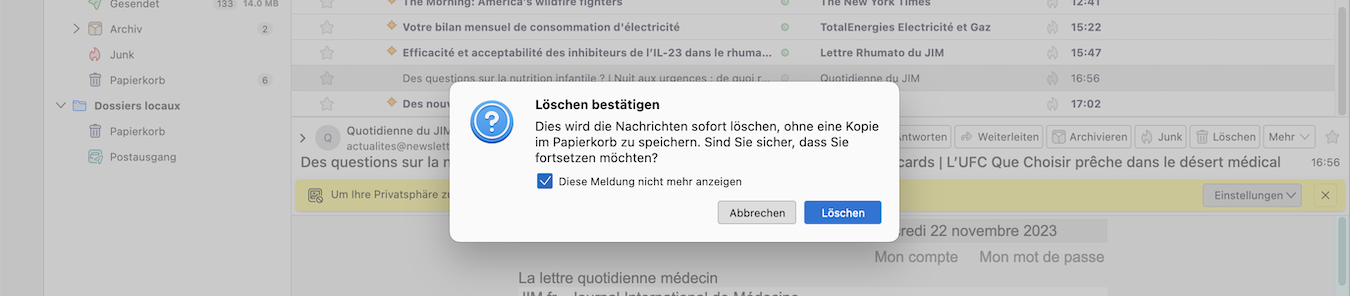 Die Frage lautet "Möchten Sie die markierten Nachricht(en) in den Papierkorb verschieben?"