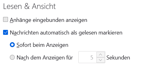 In Lesen und Ansicht ist "Nachrichten automatisch als gelesen markieren sofort beim anzeigen" markiert.