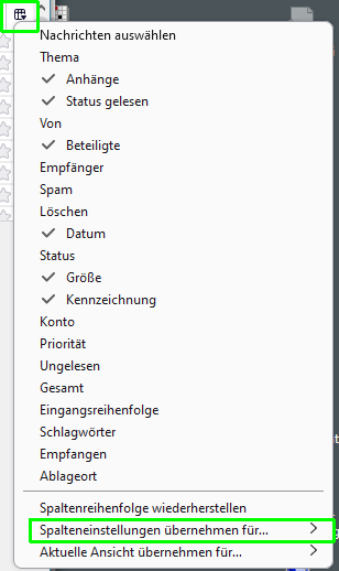 Ich lege eine Einstellung und Reihenfolge für den Postausgangsordner "Gesendet" fest und wähle dann per Rechtsklick "Spalenteinstellungen übernehmen für ..." -> "Odrner und alle Unterordner ..." usw. aus (s. Attachment: Screenshot-1).
