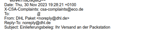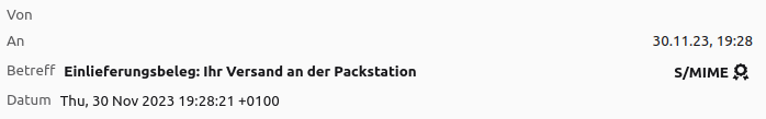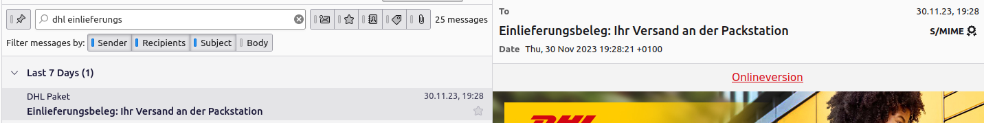 In der Emaillistenspalte "Von" steht zu untenstehender Mail nur "DHL Paket" - Spam/Phishing lässt grüßen.