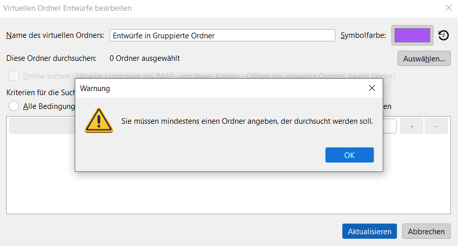 Genau da müssten die im virtuellen Ordner angezeigten Ordner ausgewählt werden, evtl. muss das Fenster größer gezogen werden.