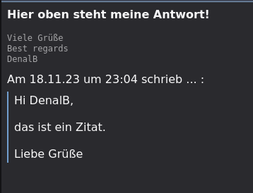 Lasse ich die Signatur allerdings in dieser Konstellation unter meiner Antwort, aber über dem Zitat anzeigen, dann fehlen sowohl beim Antworten als auch beim Weiterleiten die 2 Trennstriche.