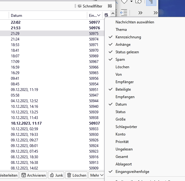 Kann ich in meinem TB das Sortieren nach dem Zeitpunkt des Sendens/Eintreffen einstellen?