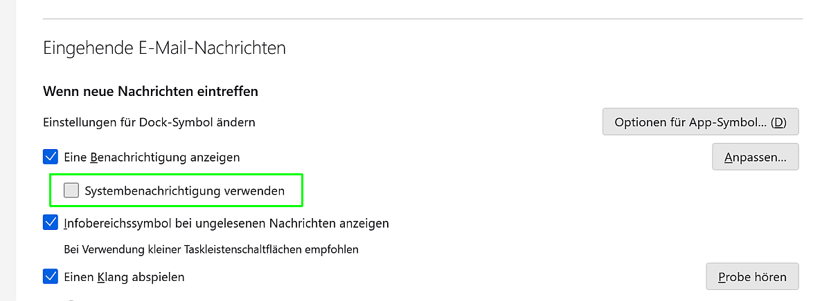 Doch jetzt ändert sich das App-Symbol in der Taskleiste nicht mehr, obwohl ich das unter "Extras" ==> "Einstellungen" ==> "Allgemein" ==> "Wenn neue Nachrichten eintreffen" entsprechend eingestellt habe: