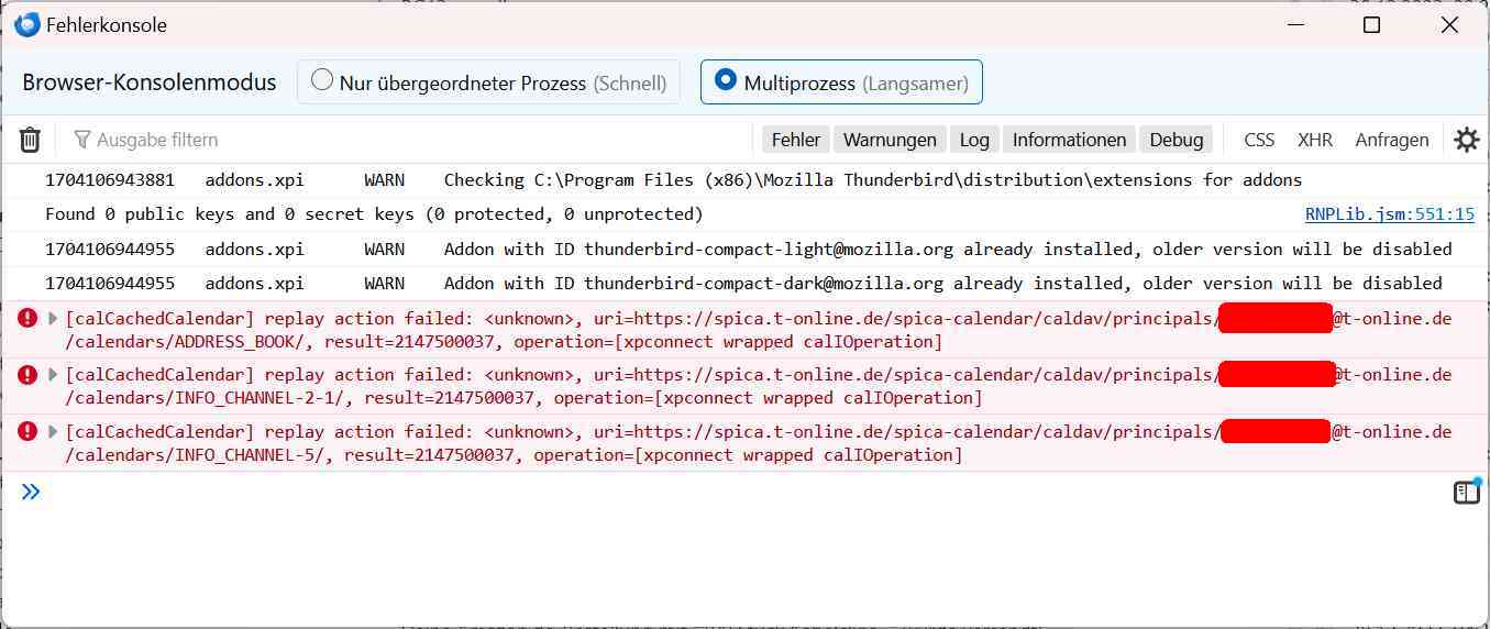 Nein, hab ich nicht - wozu auch? Thunderbird kann ja offenbar auf alles zugreifen. Vielleicht nochmal der Hinweis: es kommen immer noch die gleichen Fehler wie in #22 und das sind keine lokalen Zugriffsfehler, sondern irgendwelche Kommunikationsfehler mit dem T-Online Kalender-Server. Ich denke mal, wenn der Zugriff auf die login.json nicht gelungen wäre, dann wäre so ein grundlegender Fehler sicher auch geloggt worden. Ich hab mal rumgesucht und finde auch irgendwelche anderen Foren mit Diskussionen zu dieser Fehlermeldung, aber ich werde nicht schlau draus.