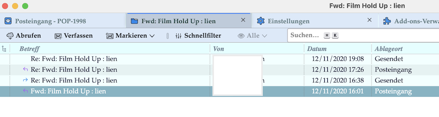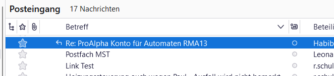 bei manchen Mails funktioniert der Themenbaum nicht (siehe Bild bei der zweiten Mailzeile). Ich antworte auf eine eingehende Mail, Thunderbird markiert die Ziele auch mit dem "lila Pfeil", dass ein Antwort gesendet wurde. Es wird aber keine Option zum Aufklappen des Themenbaums angezeigt, wie im Screenshot bei der Mail direkt darunter (dritte Mail-Zeile).