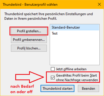 Eben da, wo ein Profil angelegt wird, kann man es auch löschen. Dabei entscheidet man individuell, ob auch die zugehörigen Dateien gelöscht werden sollen oder nur der Profil-Eintrag für Thunderbird.