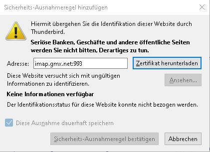 geht. Bekommen die Fehlermeldungen, die ich per Screenshots hier anhänge. Die entsprechenden imap oder ersatzeshalber POP-Nummern zog ich mir bei GMX.DE direkt herunter, schrieb sie ein, doch es funktioniert weiterhin nichts. Thunderbird ist sehr, sehr kompliziert. Bisher hielt ich große Stücke davon. War wohl ein Fehler. Da läuft das chinesische "Foxmail" entschieden einfacher. - Kurz: Was scheine ich verkehrt zu machen? Denn SÄMTLICHE Kennungen sind eigenhändig eingerichtet in den Konto-Einstellungen.