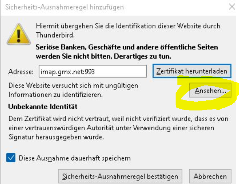 Ich nehme also an, dass du dir das Zertifikat nicht angesehen hast und somit auch den Aussteller nicht geprüft hast: das war nämlich der einzige und zudem wirklich völlig unkomplizierte Thunderbird-Tipp von mir, dass du auf den in deinen Screenshots gut erkennbaren Button "Ansehen" klickst.