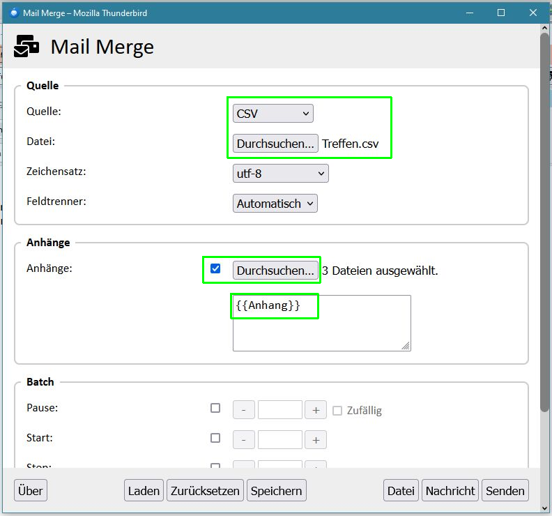 Bei Anhänge aktiviere ich das Kästchen und verknüpfe dann ebenfalls die Test-Datentabelle.ods. Im Feld darunter gebe ich die Feldfunktion {{Anhang}} ein, da in dieser Spalte die Pfade zu den einzelnen personalisierten pdf-Dokumenten stehen.