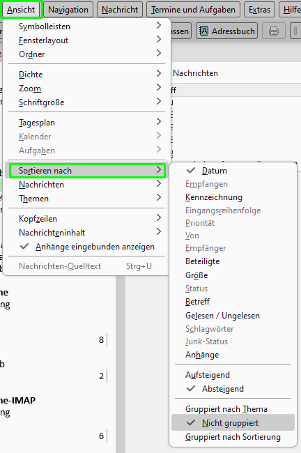 Wie kann ich die Darstellung eines eMail-Dialogs als zusammengefassten Tehmenbaum dauerhaft für alle Konten, Ordner und Unterordner abschalten ?