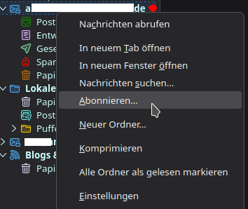 Bitte wie kann ich mit Thunderbird in IMAP-Nutzung auf den Ordner Newsletter des Providers Mail.de zugreifen. Da landen viele wichtige E-Mail drin und bisher habe ich mit Thunderbird keinen Zugriff auf den Ordner, Ordner ist unsichtbar in Thunderbird, um wenigstens die Mails in den Posteingang zu verschieben.
