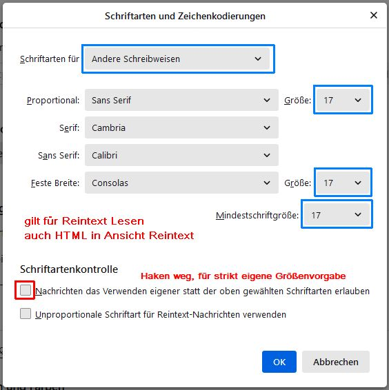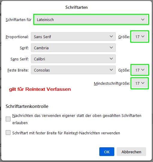 In den Einstellungen habe ich alle Schriften auf SegoeUI wg. der Monitorgröße in 18px eingestellt. Im neuen Hamburgermenu steht die Schriftgröße auf 14px und normal. HTML normal und Mails nicht erlaubt, eigene Schriften zu verwenden.