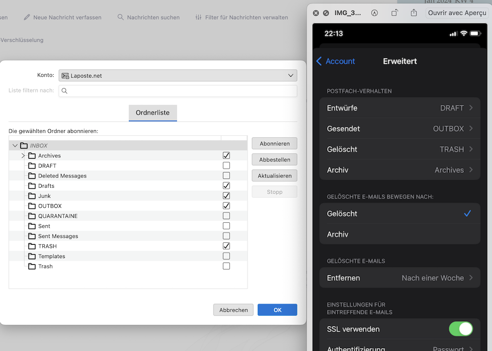 Dann musst du ein bisschen fummeln, es ist wie trial & error. Im iPhone musst du über Einstellungen > Mail > Accounts das betreffende Konto ansteuern und dann auf "Erweitert" klicken. In TB R-Klick auf den den Namen des Kontos > Abonnieren öffnet die Liste der Ordner des Kontos. Diese vergleichen mit den entsprechenden Ordnern auf dem iPhone: