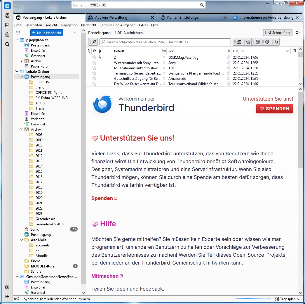Win7 ultimate Thunderbird 115.7.0 (32-Bit) -- ist aktuell POP3 A1-Provider Selbstbaurechner 2008 mit damals besten Komponenten.