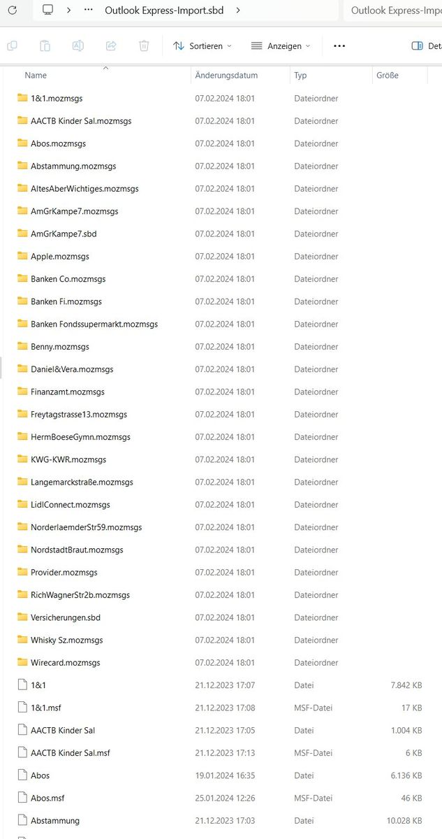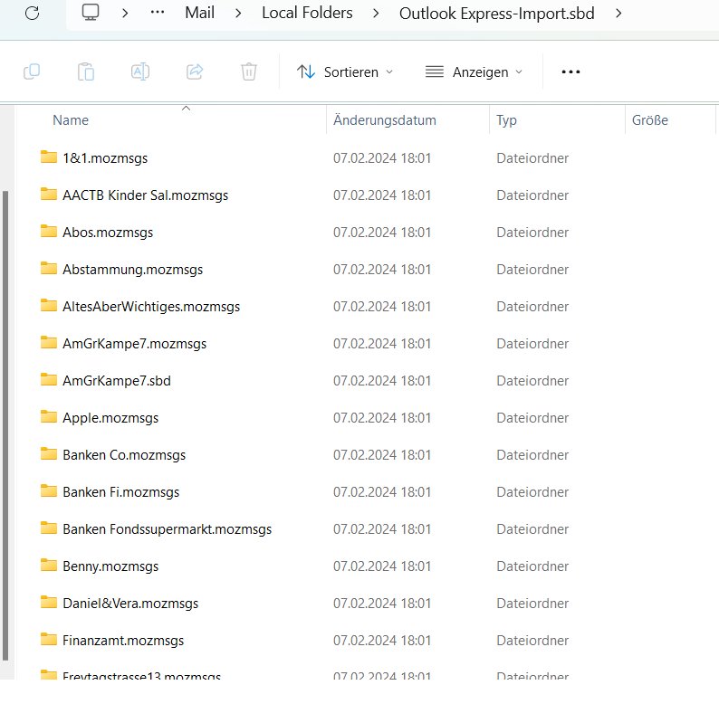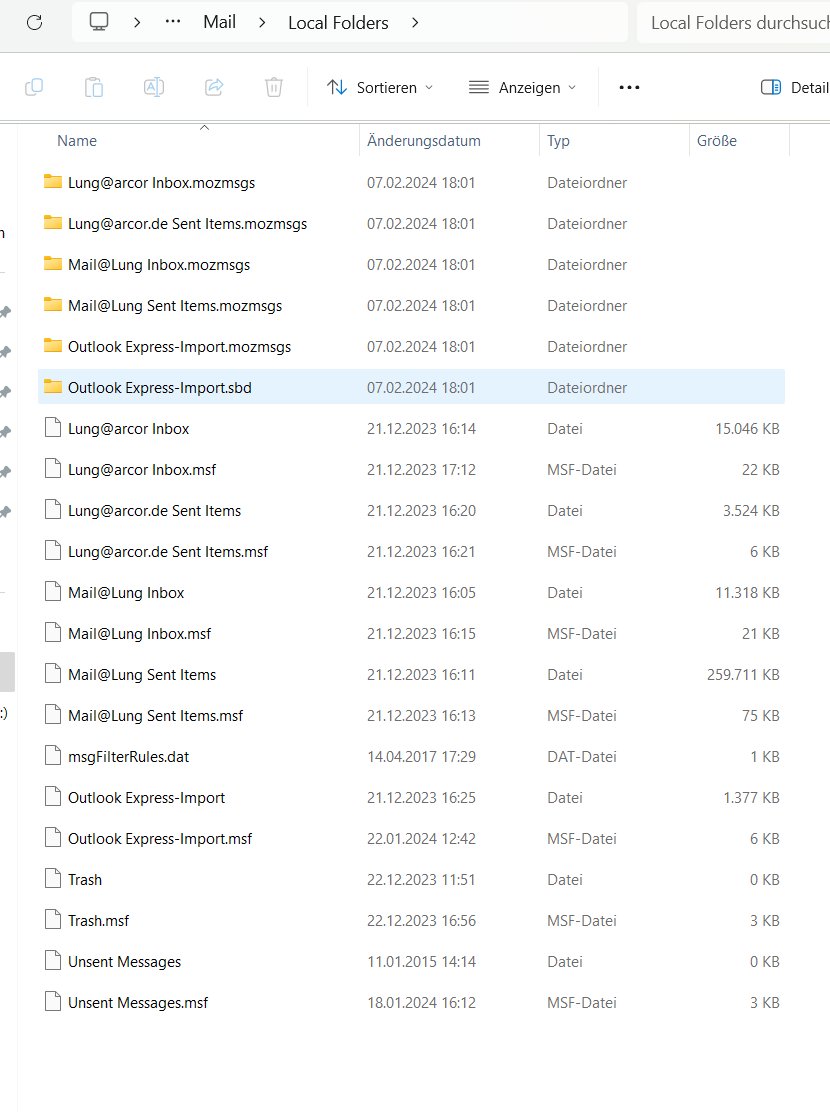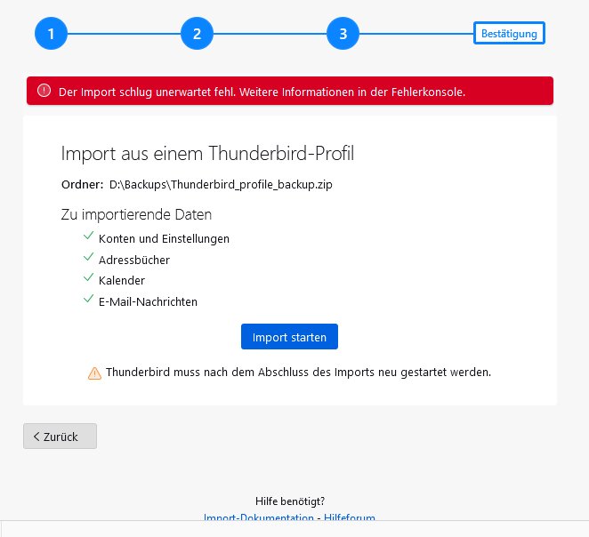 Hatte bislang WindowsLiveMail auf meinem 10Jahre-alten WINX-PC. Habe dann mit Mühen die alten Nachrichten zu TB bringen können, weil ich dachte, das sei dann einfacher mit meinem Umzug auf einen neuen WIN11-PC. Aber weit gefehlt: Der Export klappte (Thunderbird_profile_backup.zip ; hab ich auf den neuen Rechner kopiert) TB installiert. Und nun versucht zu importieren. 20% hat er fertig bekommen. Dann war Schluss: