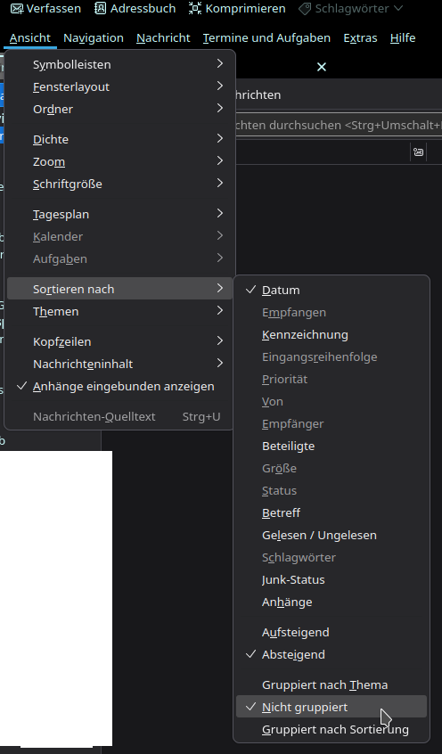 "Mails im verknüpften Format" stammt aus einer Hilfe-Anleitung, die mir zuvor ein Freund im Web gesucht und angeboten hatte. Das schien auch passend zu sein. Ließ sich allerdings bei mir nicht anwenden. Es sollte unter "Ansicht" aus den Optionen "Konversationen" ausgewählt werden. Die Option "Konversationen" gibt es bei mir aber unter "Ansicht" gar nicht. Die Hilfe-Anleitung passte also nicht.