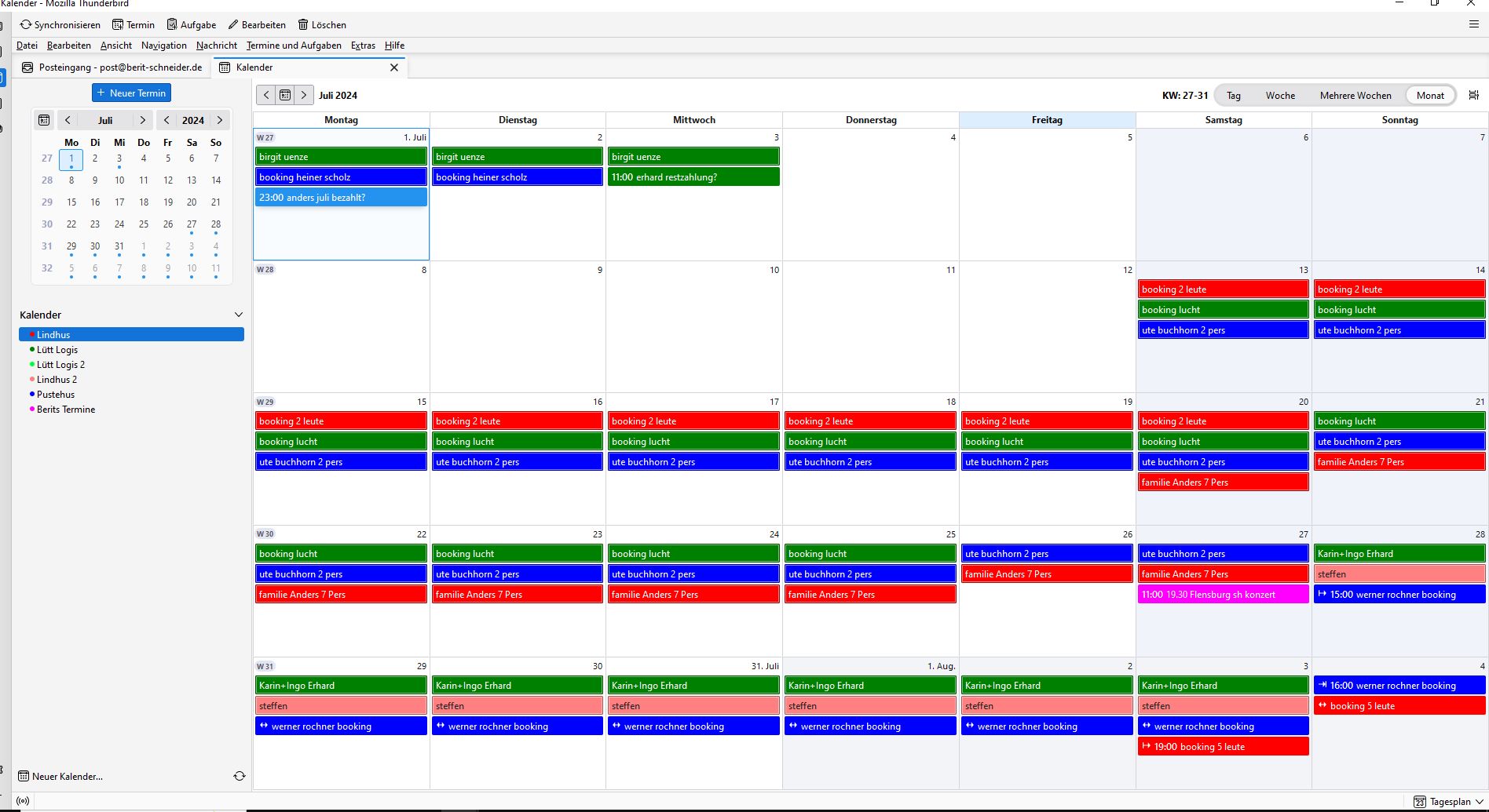 Ich habe aber noch drei weitere Kalender, die die Belegung dreier Ferienhäuser, auch farblich unterschiedlich, markieren.