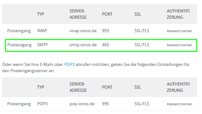 smtp.ionos.de, port 465, SSL/TLS, Passwort,normal