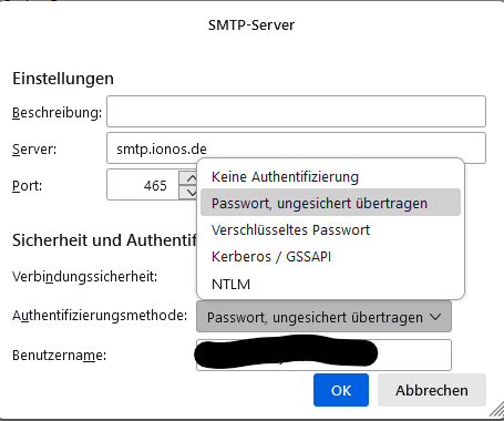 Die Auswahl bei Verbindungssicherheit und Authentifizierungsmethode ist falsch. Schau in das Bild der original IONOS Vorgaben.
