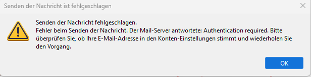 Fehler beim Senden der Nachricht. Der Mail-Server antwortete: Authentication required. Bitte überprüfen Sie, ob Ihre E-Mail-Adresse in den Konten-Einstellungen stimmt und wiederholen Sie den Vorgang.