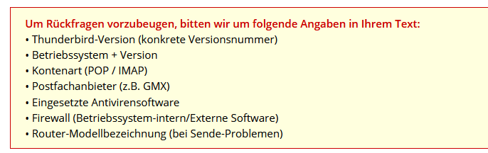 Nun habe ich das Problem, das nach 5-10 Sekunden nach öffnen von TB bereits vorhandene Nachrichten erneut heruntergeladen werden sollen, bzw. unten links steht Nachricht 1 von 285 werden Heruntergeladen, danach hängt sich TB auf. Manchmal steht auch Nachricht 1von1 wird in INBOX heruntergeladen, auch dann ist ziemlich Zeitnah ende und das Programm reagiert überhaupt nicht mehr, im Abgesicherten Modus oder Offline geht alles wie gewohnt.