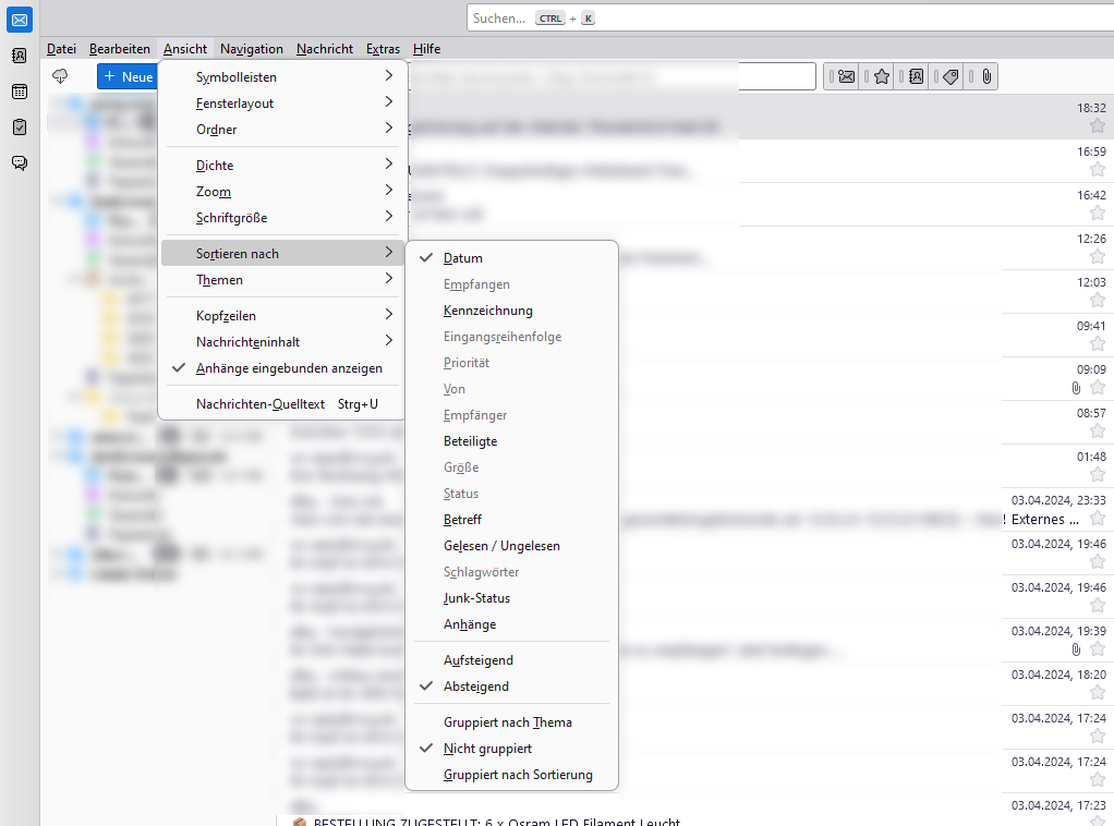 früher konnte ich die Emailgröße in Thunderbird anzeigen. Ich finde diese Einstellung nicht mehr. Ziel ist es, nach der Emailgröße zu sortieren. Die Emailgröße ist jedoch ausgegraut, siehe Screenshot.