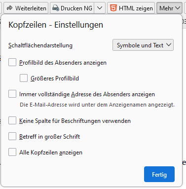 die Darstellung der Kopfzeilen (Einstellung: "normal") nervt zum einen durch ihren Platzbedarf, ca. 25 % der gesamten Fensterfläche, bei Nullkommanull Relevanz für den Empfänger, zum anderen durch ihre Sinnlosigkeit für den Normalbenutzer beim Lesen der Nachricht.